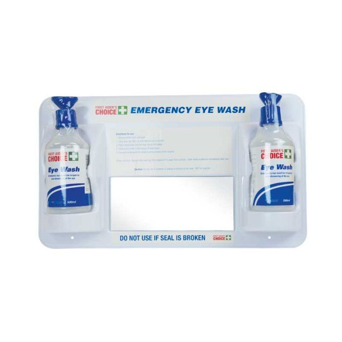 Eye Wash Wall Plate to suit FAC 500ml Saline Eye Wash Plate fits 2x 500ml Eye Wash bottles (sold separately) Features a built-in mirror